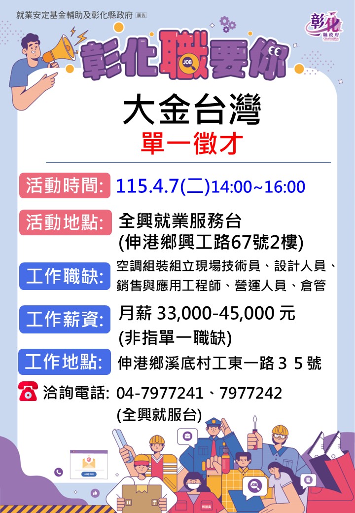 其他活動 04/07大金台灣單一徵才 發布日期 2026/03/16~2026/04/07 | 發佈單位: 勞工處就業服務科 | 發佈日期: 王麗娟 7977241 | 更新日期 2026/03/16 | 瀏覽人數: 58人 《置頂》 廠商名稱:大金台灣應用空調系統股份有限公司 時 間:115年4月7日(二) 14:00-16:00 地 點:全興就業服務台(伸港鄉興工路67號2樓) 職業名稱:空調組裝組立現場技術員、設計人員、銷售與應用工程師、營運人員、倉管等職缺 工作內容:無經驗可 工作薪資:月薪 33,000-45,000 元 雇用人數:5人 教育程度:不拘 洽詢電話:04-7977241(全興就服台)