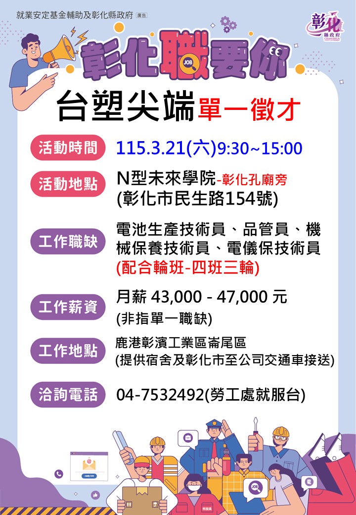 其他活動 🐬🪼0321【台塑尖端徵才活動 】📍N型未來學院🪼🐬 發布日期 2026/03/16~2026/03/21 | 發佈單位: 勞工處就業服務科 | 發佈日期: 勞工處就服台 04-7532492 | 更新日期 2026/03/16 | 瀏覽人數: 30人 《置頂》 🐾廠商名稱:台塑尖端能源科技股份有限公司 🐾 🕤活動時間:115年3月21日 星期六 9:30 ~ 15:00 🕒 活動地點:N型未來學院 【彰化市民生路154號-彰化孔廟旁】 職業名稱:電池生產技術員、品管員、機械保養技術員、電儀保技術員、生產技術技術員 (配合輪值-四班三輪) 💰薪 資:43,000-47,000元(非指單一職缺) 💰 💎公司簡介:台塑新智能2023年透過子公司「台灣尖端能源」在彰濱工業區投資上百億元,建造全台灣規模最大的5GWh鋰鐵電芯及模組廠,為電動車及儲能系統提供安全、穩定的鋰鐵電芯,打造完整的國產電池產業鏈,開啟台灣新能源產業的新紀元。 福利制度: 年資每滿五年贈1枚24K紀念金幣、每年固定調薪制度、高於業界水準的年終及三節獎金、員工及眷屬至長庚醫院就醫補助、免費健檢、保健諮詢服務、電動機車換購補助1.6萬元、新購補助1萬元、生日禮物券、三節福利券、春秋兩季員工郊遊、踏青補助、歲末年終歡樂聚餐、0到6歲每月2千元育兒補助、懷孕福袋、寶寶禮品及禮金、子女教育獎學金 工作內容:電池製造業 交通能力:1.自行前往2.提供宿舍3.彰化市至公司交通車接送 工作地點:鹿港彰濱工業區崙尾區 工作時間:日班、輪班(四班三輪) 洽詢電話:04-7532492 (勞工處就服台)