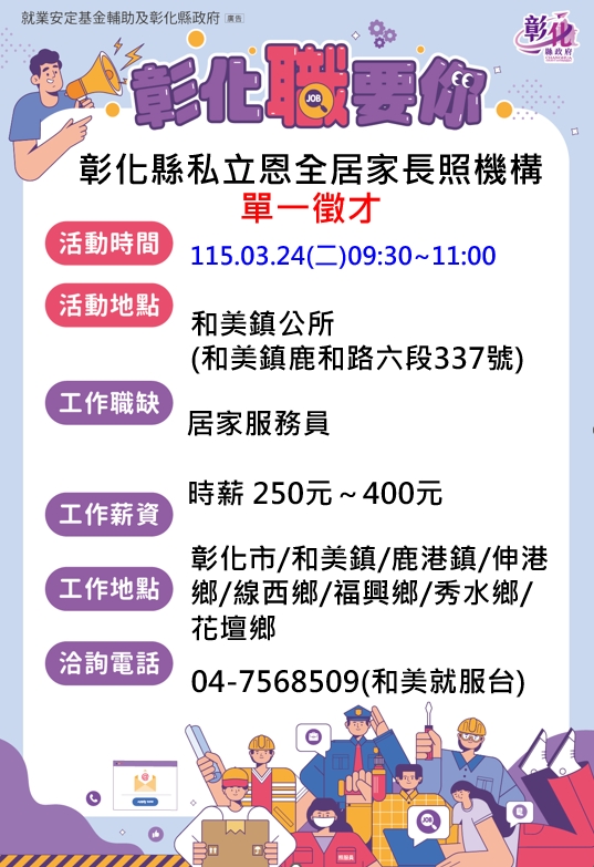 其他活動 🎉🎉🎉1150324恩全居家單一徵才活動!!!~和美鎮公所 發布日期 2026/03/17~2026/03/24 | 發佈單位: 勞工處就業服務科 | 發佈日期: 王靜儀 04-7568509 | 更新日期 2026/03/17 | 瀏覽人數: 40人 廠商名稱:彰化縣私立恩全居家長照機構 時 間:115年03月24日(二)09:30-11:00 地 點:和美鎮公所【和美鎮鹿和路六段337號】 職業名稱:居家服務員 雇用條件: 具備長照小卡/照顧服務人員證書、身心障礙支持服務結業證書、失智症照顧服務結業證書(優先錄取) /需有汽機車駕照 工作時間:排班制 工作內容: 家務服務、身體照顧服務、參與督導會議及教育訓練、其他主管交辦之事項、遵循機構訂定之管理規章工作倫理及守則 工作薪資:時薪250元~400元(固定或變動薪資因個人資歷或績效而異) 工作地點:彰化市/和美鎮/鹿港鎮/伸港鄉/線西鄉/福興鄉/秀水鄉/花壇鄉 教育程度:國小 洽詢電話:04-7568509和美就業服務台