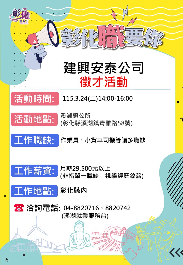 其他活動 🔥3/24建興安泰溪湖公所徵才活動🔥 發布日期 2026/03/20~2026/04/20 | 發佈單位: 勞工處就業服務科 | 發佈日期: 溪湖就服台 04-8820716 | 更新日期 2026/03/20 | 瀏覽人數: 13人 🔥3/24建興安泰溪湖公所徵才活動🔥 性 質:單一徵才活動 廠商名稱:建興安泰公司 ⏰時 間:115年3月24日(二)14:00-16:00 地 點:溪湖鎮公所一樓 (彰化縣溪湖鎮青雅路58號) 職業名稱:作業員、小貨車司機 薪 資:月薪29,500元起(非指單一職缺,視學經歷敘薪) 工作地點:彰化縣內 ☎️連絡電話:04-8820716、8820742 溪湖就服台