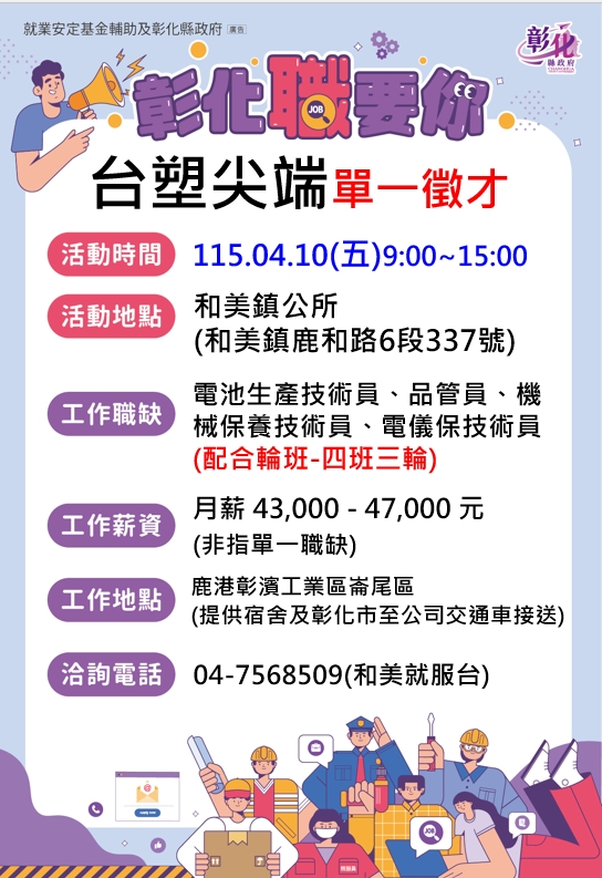 其他活動 0410台塑尖端徵才活動 📍和美鎮公所 發布日期 2026/03/30~2026/04/10 | 發佈單位: 勞工處就業服務科 | 發佈日期: 王靜儀 7568509 | 更新日期 2026/03/30 | 瀏覽人數: 21人 🔆廠商名稱:台塑尖端能源科技股份有限公司 🕤活動時間:115年4月10日 星期五 9:00 ~ 15:00 🔅活動地點:和美鎮公所 【和美鎮鹿和路6段337號】 *️⃣職業名稱:電池生產技術員、品管員、機械保養技術員、電儀保技術員、生產技術技術員 (配合輪值-四班三輪) 💰薪 資:43,000-47,000元(非指單一職缺) 💰 💎公司簡介:台塑新智能2023年透過子公司「台灣尖端能源」在彰濱工業區投資上百億元,建造全台灣規模最大的5GWh鋰鐵電芯及模組廠,為電動車及儲能系統提供安全、穩定的鋰鐵電芯,打造完整的國產電池產業鏈,開啟台灣新能源產業的新紀元。 💥福利制度: 年資每滿五年贈1枚24K紀念金幣、每年固定調薪制度、高於業界水準的年終及三節獎金、員工及眷屬至長庚醫院就醫補助、免費健檢、保健諮詢服務、電動機車換購補助1.6萬元、新購補助1萬元、生日禮物券、三節福利券、春秋兩季員工郊遊、踏青補助、歲末年終歡樂聚餐、0到6歲每月2千元育兒補助、懷孕福袋、寶寶禮品及禮金、子女教育獎學金 ▶️工作內容:電池製造業 ▶️交通能力:1.自行前往2.提供宿舍3.彰化市至公司交通車接送 ▶️工作地點:鹿港彰濱工業區崙尾區 ▶️工作時間:日班、輪班(四班三輪) ☎️洽詢電話:04-7568509 (和美就服台)