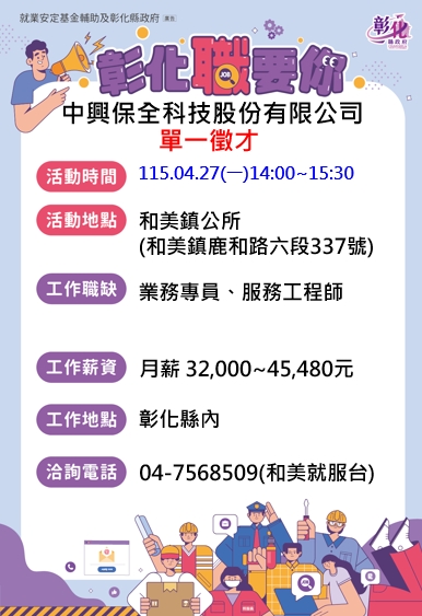 其他活動 1150427中興保全科技股份有限公司單一徵才活動🎈🎈🎈和美鎮公所 發布日期 2026/04/14~2026/04/27 | 發佈單位: 勞工處就業服務科 | 發佈日期: 王靜儀 7568509 | 更新日期 2026/04/14 | 瀏覽人數: 120人 🔆🔆廠商名稱:中興保全科技股份有限公司 🕤活動時間:115年4月27日 星期一 14:00 ~ 15:30 🔅活動地點:和美鎮公所 【和美鎮鹿和路6段337號】 *️⃣職業名稱:服務工程師/業務專員 💰薪 資:月薪32,000-45,480元(非指單一職缺) 💰 💎公司簡介: 中興保全科技股份有限公司為中保科技集團的主要成員之ㄧ,以結合科技應用的「中保無限+」服務體系,做為物聯網實踐者。在安全服務之外,增加服務的方便性與趣味性。 💥福利制度: ◆ 分紅:視營運狀況發給員工紅利。 ◆ 獎金 / 禮品:1.端午、中秋及年終獎金2.三節禮金或禮品。 ◆ 保險:除法定勞保、健保外,另有團體醫療保險。 ◆ 休閒、運動:籃球、羽球、電影社等社團活動。 ◆ 制度類:完整的職前及在職訓練,年度晉升審查辦法,業績獎勵辦法,人才介紹獎金,分公司儲備經理之甄選與訓練辦法等。 ◆ 休假制度:每週調移休息二日〈部分營業、服務、客服人員為排班制〉,有特休、陪產假、及法令規範之假別。 ◆ 其他福利:健康檢查、結婚禮金、社團補助、員工及子女教育獎助學金、住院慰問金,及每年親子活動等。 ▶️工作地點:彰化縣市 ☎️洽詢電話:04-7568509 (和美就服台)