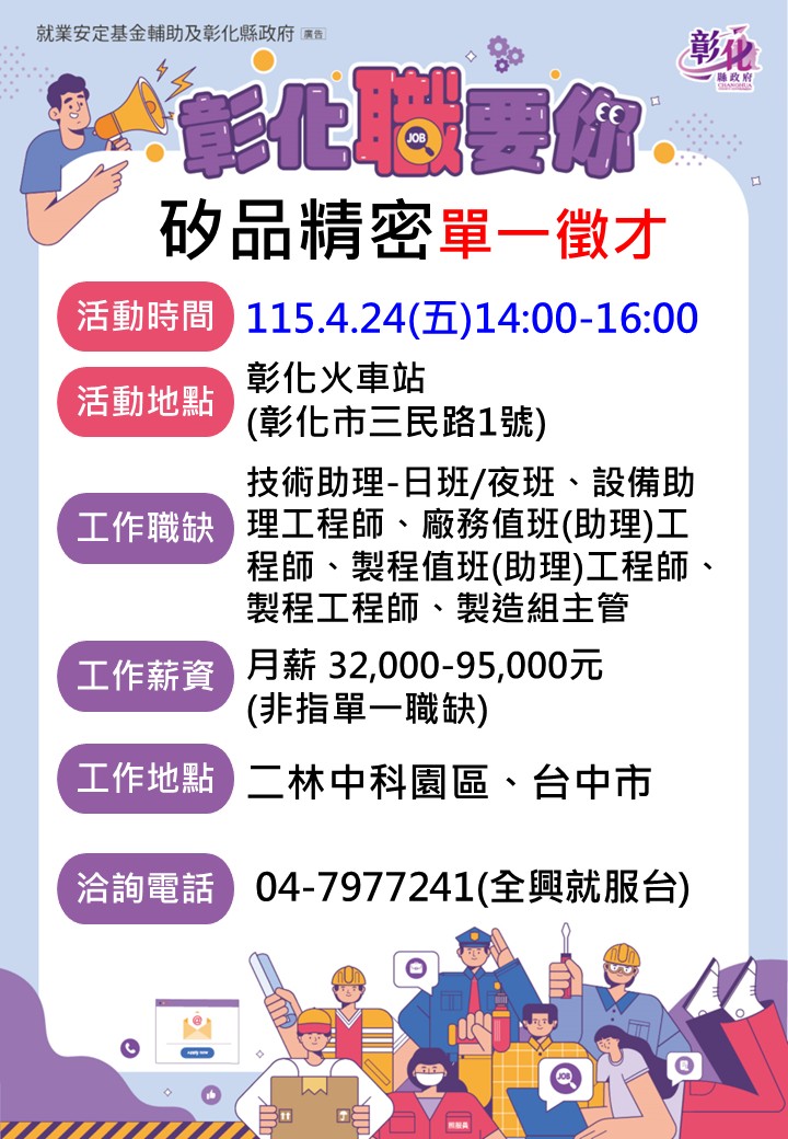 其他活動 4/24矽品精密單一徵才 發布日期 2026/04/21~2026/04/24 | 發佈單位: 勞工處就業服務科 | 發佈日期: 王麗娟 7977241 | 更新日期 2026/04/21 | 瀏覽人數: 11人 115/4/24矽品精密單一徵才 廠商名稱:矽品精密工業股份有限公司 活動時間:115年4月24日(星期五) 14:00 ~ 16:00 活動地點:彰化火車站【彰化市三民路1號】 職業名稱:技術助理-日班/夜班、設備助理工程師、廠務值班(助理)工程師、製程值班(助理)工程師、製程工程師、製造組主管 薪 資:32,000 - 95,000元(非指單一職缺) 教育程度:高中職以上 交通能力:能自行前往 工作地點:彰化縣和美、中科二林廠/台中市 工作時間:輪班/日班/夜班 僱用期限:長期性 公司簡介: 矽品公司成立於民國73年,主要提供各項積體電路封裝及測試之服務。 公司福利制度: 1.三節獎金、季績效獎金依公司獲利發放。 2.每年提撥10%可分配盈餘,經營成果全員共享。 3.生產獎金:每月依營收達成狀況及個人績效表現發放,資深員工獎勵金。 4.育兒津貼每名補助5,000元/月。 5.餐費補助及豐富多樣員工餐。 6.設施-廠內設有便利商店。 7.提供四星級宿舍、健身房、KTV、才藝教室等。 8.備有交通車接送上下班。 9.各項補助、各式票券禮卷等。 10.社團活動、定期員工健檢、廠商駐廠服務、旅行規劃活動等安排…等 洽詢電話:全興就服台 04-7977241、04-7977242