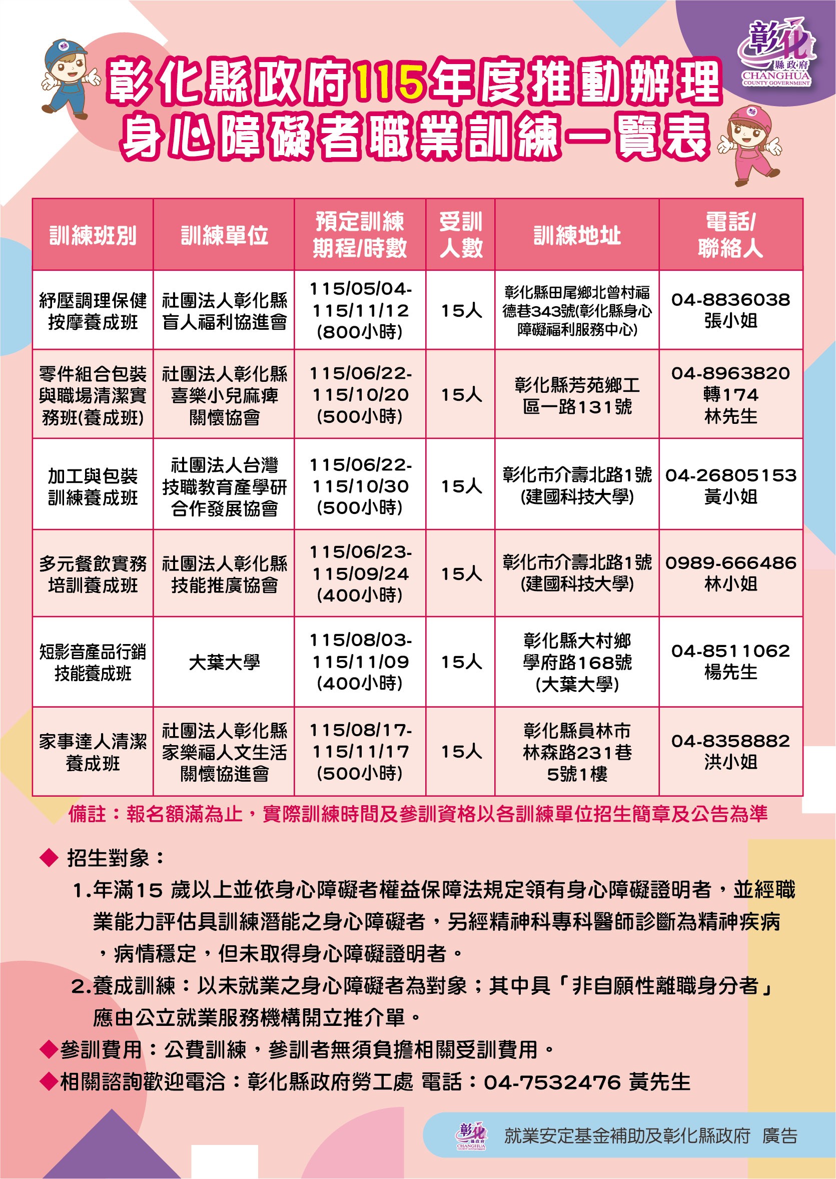 教育研習 領補助、學技能、助就業! 彰化縣政府115年身心障礙者職業訓練-熱情招生中! 發布日期 2026/04/24~2026/07/31 | 發佈單位: 勞工處 | 發佈日期: 黃宥嘉 7532476 | 更新日期 2026/04/24 | 瀏覽人數: 29人 領補助、學技能、助就業! 彰化縣政府115年身心障礙者職業訓練-熱情招生中! 縣府為了協助縣內身障朋友們提升就業技能,順利進入職場就業、創業並在職場穩定就業,今(115)年規劃辦理6班身心障礙者職業訓練,課程種類多元,包含短影音產品行銷技能、零件組合包裝與職場清潔實務、加工與包裝訓練、多元餐飲實務培訓、家事清潔達人、紓壓調理保健按摩等養成班課程,結訓後可對接縣內產品包裝設計、產品行銷、社群小編等數位行銷職缺,機械五金、玻璃加工、車輛零組件及五金零件等製造業缺工職缺,以及服務業清潔人員、專業按摩人員或餐飲技術人員,即日起開放報名。 養成訓練班以未就業之身心障礙者為對象,並經職業能力評估具訓練潛能,受訓期間符合資格條件者可申請職訓生活津貼,培訓學員專業技能,課程內容因應多重行業工作需求,訓後輔導從事多樣化的工作。 相關職業訓練課程資訊,可至縣府所設立的8處就業服務台洽詢或至彰化縣政府勞工處網站、勞工處臉書粉絲團查詢,亦可撥打勞工處專線(04-7532476 黄先生)洽詢。 彰化縣政府勞工處網站(https://labor.chcg.gov.tw) 勞工處臉書粉絲團(https://www.facebook.com/labor.chcg/)