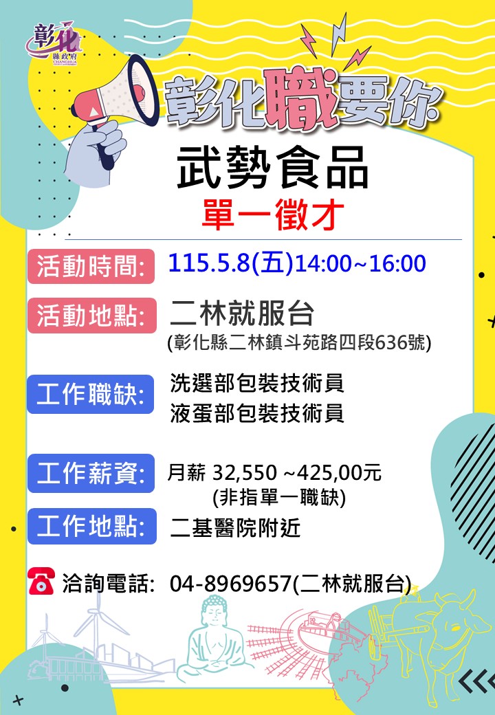 其他活動 5/8武勢食品單一徵才 發布日期 2026/04/27~2026/05/08 | 發佈單位: 勞工處就業服務科 | 發佈日期: 李曉芸 04-8969667 | 更新日期 2026/04/27 | 瀏覽人數: 9人 5/8武勢食品單一徵才 性 質:廠商單一徵才活動 廠商名稱:武勢食品股份有限公司 時 間:115年5月8日(五)14:00-16:00 地 點:二林就服台(二林鎮斗苑路四段636號) 職業名稱:洗選部包裝技術員、液蛋部包裝技術員 薪 資:月薪32,550-42,500元 (非指單一職缺) 教育程度:不拘 工作地點:二林鎮 連絡電話:04-8969657、04-8969667二林就服台
