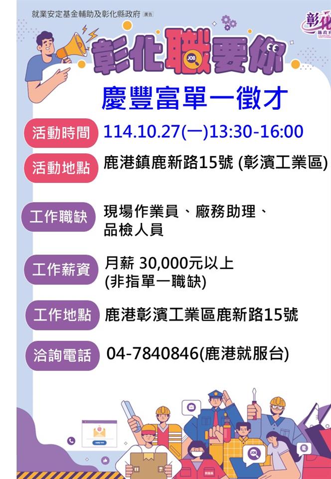 活動快訊 10/27慶豐富單一徵才 歷史訊息 | 發布日期 2025/10/21~2025/10/27 | 發佈單位: 勞工處就業服務科 | 發佈日期: 陳小姐 04-7840846 | 更新日期 2025/10/21 | 瀏覽人數: 2人 性 質:單一廠商徵才活動 廠商名稱:慶豐富實業股份有限公司 活動時間:114年10月27日(星期一) 13:30~ 16:00 活動地點:慶豐富廠內【鹿港鎮鹿新路15號】 職業名稱:現場作業員、廠務助理、品檢人員 薪 資:30,000元以上(非指單一職缺) 營業項目:無繩安全窗簾、成人與嬰兒床上用品、 芮格居家 公司簡介:於民國66年3月設立於彰化縣,於88年正式掛牌上市為公開發行公司,並通過ISO9001國際認證,目前除了彰化有兩個生產工廠外,分別於美國東西兩岸分別設有行銷據點,泰國與中國大陸分別有生產工廠。目前是國內最大室內傢飾製造商。 福利制度: 1..教育訓練 2.婚,喪,娩補助 3.三節、勞動節禮金或禮券、員工生日禮金或禮券 4.國內旅遊、尾牙 5.特休/年假 6.特約商店等 雇用人數:共7人 教育程度:不拘以上 工作地點:鹿港彰濱工業區鹿新路15號 工作時間:日班 洽詢電話:04-7840846(鹿港就服台)