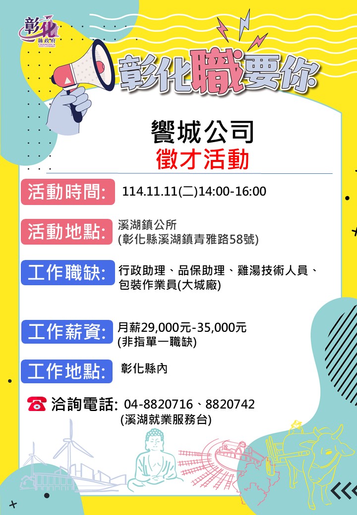 活動快訊 🔥11/11饗城食品單一溪湖公所徵才活動🔥 歷史訊息 | 發布日期 2025/11/05~2025/12/05 | 發佈單位: 勞工處就業服務科 | 發佈日期: 溪湖就業服務站 04-8820716 | 更新日期 2025/11/05 | 瀏覽人數: 6人 台灣製造之前,是彰化製造。 想讓世界知道你來自彰化? 想用技術改變未來? 加入彰化製造,從這裡開始發光! 台灣製造的故事,由你接棒! 🔥11/11饗城食品單一溪湖公所徵才活動🔥 性 質:單一徵才活動 廠商名稱:饗城食品 ⏰時 間:114年11月11日(二)14:00-16:00 地 點:溪湖鎮公所一樓 (彰化縣溪湖鎮青雅路58號) 職業名稱:行政助理、品保助理、雞湯技術人員、包裝作業員(大城廠) 薪 資:月薪29,000元-35,000元以上 (非指單一職缺,視學經歷敘薪) 工作地點: 彰化縣內 ☎️連絡電話:04-8820716.8820742 溪湖就服台