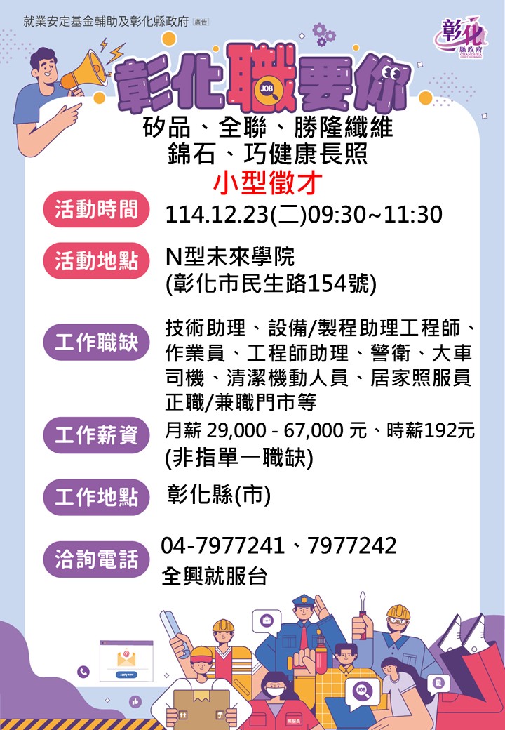 活動快訊 👉👉12/23年底轉職好機會~N型未來學院小型徵才活動 歷史訊息 | 發布日期 2025/12/12~2025/12/23 | 發佈單位: 勞工處就業服務科 | 發佈日期: 林小姐 7568509 | 更新日期 2025/12/12 | 瀏覽人數: 3人 12/23年底轉職好機會~N型未來學院徵才活動 廠商名稱:矽品、全聯、勝隆纖維、巧健康長照、錦石 活動時間:12月23日(星期二)上午09:30-11:30 活動地點:N型未來學院(彰化市民生路154號/孔廟旁) 工作地點:彰化縣市 薪 資:月薪29,000~45,450元、時薪192元(非單一職缺) 工作時間:依公司規定 洽詢電話:全興就服台04-7977241 、7977242 活動職缺: 1.矽品:技術助理(固定日班/夜班)、設備工程師、設備助理工程師、製造組主管、製程值班助理工程師、M值班助理工程師、理貨助理工程師等 2.全聯:正職門市、兼職門市 3.勝隆纖維:製程工程師助理、設備工程師助理、輪三班作業員、警衛、大貨車司機、實驗分析人員、會計。 4.巧健康長照:居家照服員。 5.錦石:專案助理、清潔機動工程人員、機動工程領班。 雇用人數:.52人 教育程度:不拘、國中以上、高中職、專科、大學