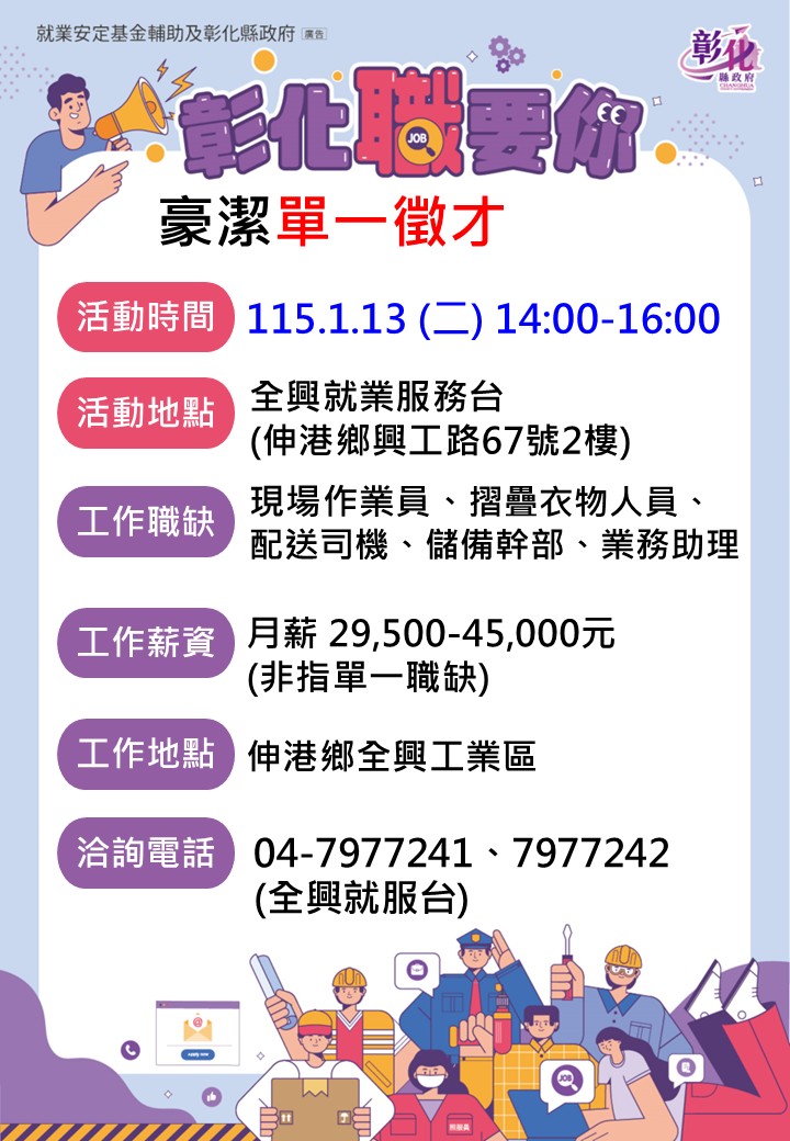 活動快訊 ☘️ ☘️年底找個好工作~1/13豪潔單一徵才 歷史訊息 | 發布日期 2025/12/24~2026/01/13 | 發佈單位: 勞工處就業服務科 | 發佈日期: 林小姐 7977242 | 更新日期 2025/12/24 | 瀏覽人數: 1人 ☘️ ☘️年底找個好工作~1/13豪潔單一徵才 性 質:廠商單一徵才活動 廠商名稱:豪潔實業股份有限公司 時 間:115年1月13日(二) 下午2:00-4:00 地 點:全興就業服務台(伸港興工路67號2樓/全興產業園區服務中心) 職業名稱:現場作業員、業務助理、配送司機、摺疊衣物人員/布服整理、儲備幹部 薪 資:月薪29,500元 ~45,000元(非指單一職缺) 教育程度:不拘 工作地點:彰化縣伸港鄉 年底找個好工作,歡迎應徵~ 🙋 🙋 🙋 連絡電話:04-7977241、7977242全興就服台 ◎豪潔公司簡介:我們重視每一位員工,除了有良好工作環境、也提供學習及成長的空間,歡迎優秀的朋友一起加入豪潔實業股份有限公司的工作行列。 ◎豪潔公司福利制度:1獎金-三節禮金、推薦優秀人才獎金、在職員工及子女獎學金、生日禮金、專案加給 2.補助-結婚補助、住院及喪葬慰問金 3.同仁制服 4.員工聚餐5.尾牙 6.在職訓練 7.免費健康檢查
