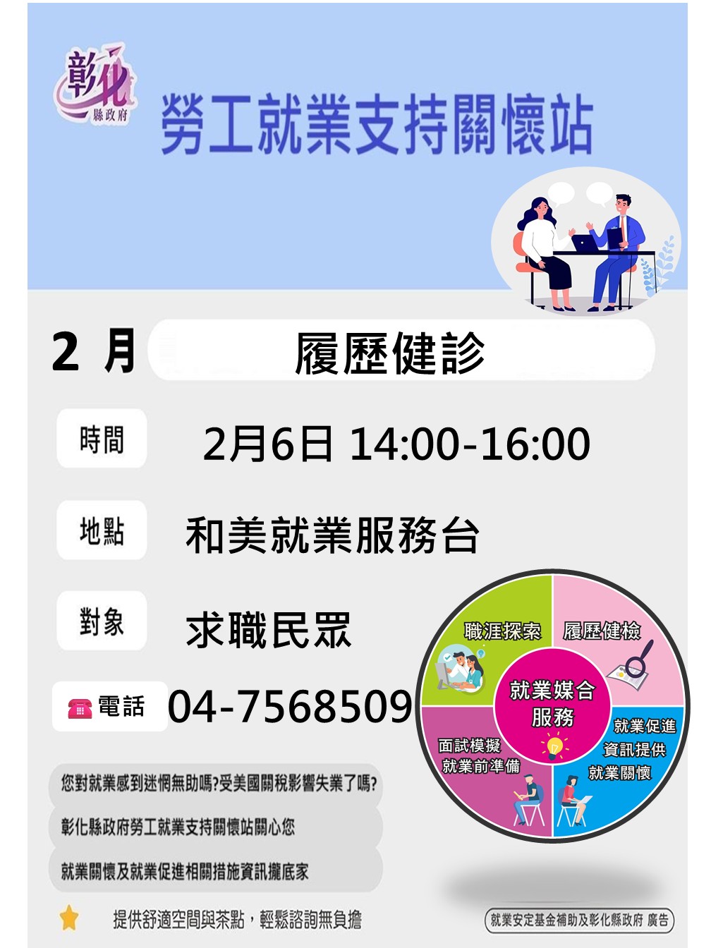 活動快訊 0206就業支持關懷站-履歷健檢(下午場) 歷史訊息 | 發布日期 2026/01/26~2026/02/06 | 發佈單位: 勞工處就業服務科 | 發佈日期: 和美就服台 04-7568509 | 更新日期 2026/02/09 | 瀏覽人數: 38人 當日有搭配矽品、全聯、大通單一徵才活動進行,協助你面試前的履歷健檢,提高錄取成功率呦~~ 115/02/06就業支持關懷站-履歷健檢 🕒時 間:115/02/06(五)14:00-1600 🏠地 點:N型未來學院-彰化孔廟旁(彰化市民生路154號) 👩🏻🤝👨🏼參加對象:任何人 ☎️報名專線:04-75685099和美就服台 彰化縣政府-就業支持關懷站,提升本縣民眾求職與企業招募之媒合效率,並提供多元且貼心的就業支援服務。 本府提供使用者有文書軟體選擇的權利,本網站文件皆為ODF開放文件格式,建議您安裝 免費開源軟體 或以您慣用的軟體開啟。