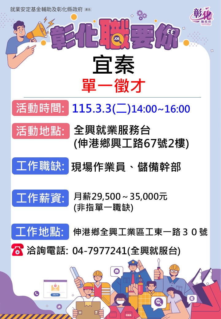 活動快訊 03/03宜秦單一徵才 歷史訊息 | 發布日期 2026/02/26~2026/02/03 | 發佈單位: 勞工處就業服務科 | 發佈日期: 王麗娟 04-7977241 | 更新日期 2026/02/26 | 瀏覽人數: 2人 廠商名稱:宜秦食品股份有限公司 時 間:115年3月3日(三) 14:00-16:00 地 點:全興就業服務台(伸港鄉興工路67號2樓) 職業名稱:現場作業員、儲備幹部等職缺 工作內容:無經驗可 工作薪資:月薪29,500元~35,000元 雇用人數:5人 教育程度:不拘 洽詢電話:04-7977241