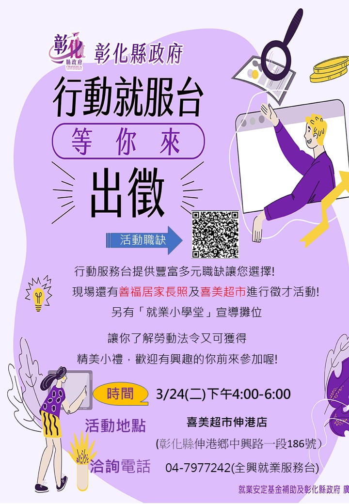 活動快訊 ✨ ✨3/24善福居家長照機構、金喜美行動就服台徵才活動 歷史訊息 | 發布日期 2026/03/20~2026/03/24 | 發佈單位: 勞工處就業服務科 | 發佈日期: 林小姐 7977242 | 更新日期 2026/03/20 | 瀏覽人數: 5人 ✨ ✨3/24善福居家長照機構、金喜美行動就服台徵才活動 廠商名稱:善福居家長照機構、金喜美「行動就業服務台 等你來出徵」徵才活動 活動日期:114.3.24(二)下午4:00~6:00 活動地點:喜美超市伸港店 (伸港鄉中興路一段186號) 活動廠商及職缺: 一、善服有限公司附設彰化縣私立善福居家長照機構 🏃♀️ 🏃 1.職缺: 居家服務照服員、督導員、行政人員、伸港鄉西個案關懷人員 2.薪資: 月薪29,500元以上、時薪230元(非指單一職缺) 3.工作地點:彰化縣市 4.福利制度:交通津貼/轉場補助、長照險/24小時意外險、三節獎金(年終獎,端午、中秋發放獎金或禮品)、提供在職訓練與專業進修課程、彈性工時制度與排班自主性提供困難照顧獎金(依政府核定為主) 二、金喜美股份有限公司(喜美超市) 🤸🤸♂️ 1.職缺:賣場營業人員、倉管、儲備幹部、肉品人員、生鮮包裝、生鮮助理 2.薪資: 月薪30,550元~31,550元(非指單一職缺) (非指單一職) 3.工作地點:伸港、福興、鹿港、彰化 4.福利制度:年終獎金、績效獎金、員工健檢、員工聚餐、員工制服、員工旅遊、春酒、婚喪喜慶補助金、員購福利、員工健康檢查、教育訓練、良好升遷制度...等。 洽詢電話:全興就服台 04-7977241、7977242 ★參加求職還有精美小禮物等你來領取,活動現場另設置「就業小學堂」宣導攤位,規劃多項勞動法令問題供民眾作答,答對者即可獲得精美小禮,讓現場求職民眾滿載而歸,歡迎有興趣者把握機會前往面試! ★另外相關徵才活動訊息可至縣府所設立的8處就業服務台洽詢、撥打免付費專線0800-529191(我愛就業就業)、上網到縣府首頁-活動快訊查詢http://www.chcg.gov.tw)、台灣就業通(http://www.taiwanjobs.gov.tw)、彰化就業通平台(https://job.chcg.gov.tw/)或到彰化縣政府勞工處粉絲團(https://www.facebook.com/labor.chcg/)查詢。