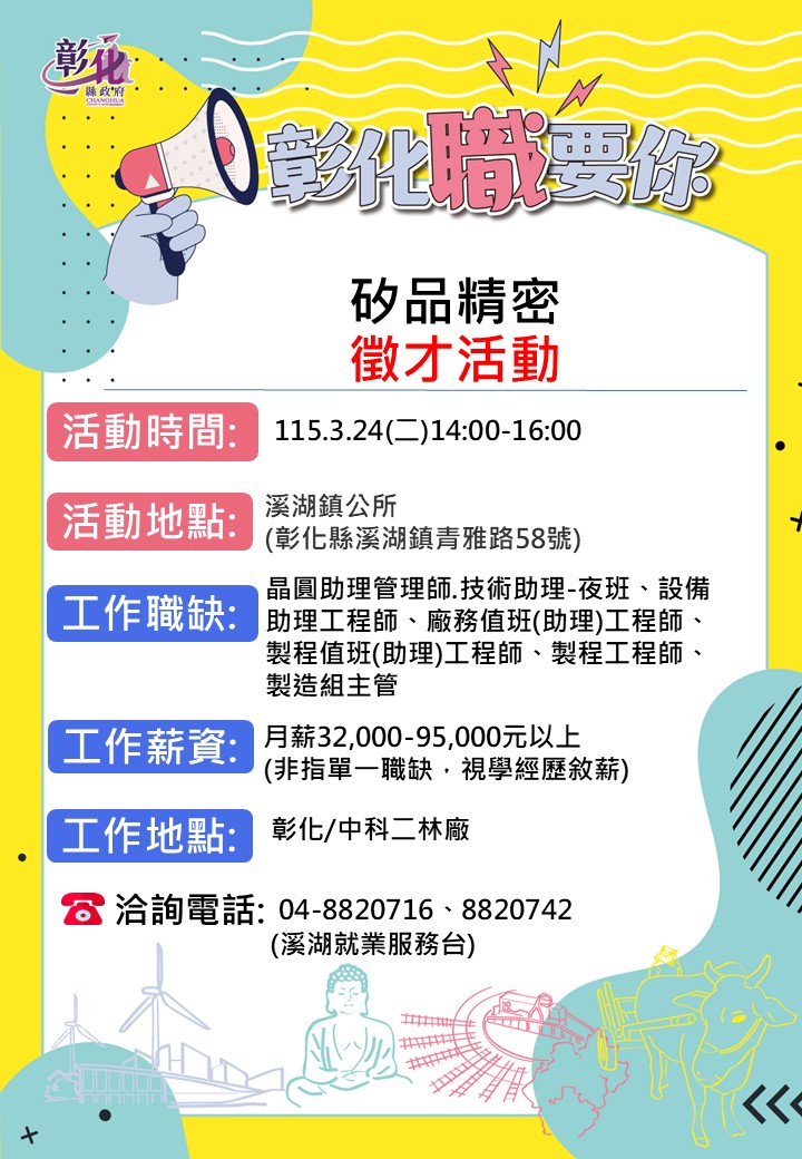 活動快訊 🔥邁向高科技-3/24矽品公司溪湖公所徵才活動🔥 歷史訊息 | 發布日期 2026/03/20~2026/03/24 | 發佈單位: 勞工處就業服務科 | 發佈日期: 溪湖就服台 04-8820716 | 更新日期 2026/03/20 | 瀏覽人數: 5人 從在地走向世界,我們的驕傲來自每一雙勤奮的手。 加入我們,成為「彰化製造」的一員, 一起讓世界看見台灣的實力。 🔧 工程師徵才中|用專業築夢,用雙手創未來。 🔥邁向高科技-3/24矽品公司溪湖公所徵才活動🔥 性 質:單一徵才活動 廠商名稱:矽品精密 ⏰時 間:115年3月24日(二)14:00-16:00 地 點:溪湖鎮公所(彰化縣溪湖鎮青雅路58號) 職業名稱:晶圓助理管理師.技術助理-夜班、設備助理工程師、廠務值班(助理)工程師、製程值班(助理)工程師、製程工程師、製造組主管、 薪 資:月薪32,000-95,000元 (非指單一職缺,視學經歷敘薪) 工作地點: 彰化縣內、二林中科 ☎️連絡電話:04-8820716 溪湖就服台