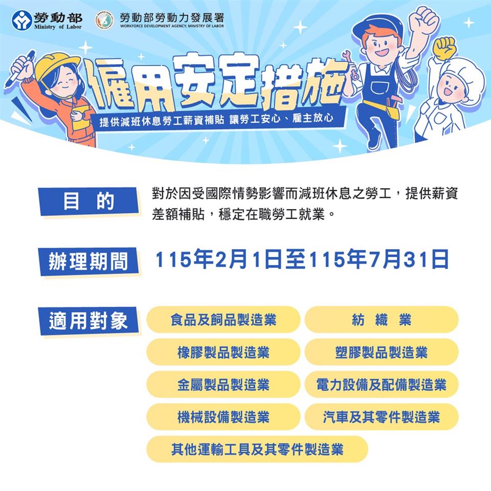 維持僱用安定措施 瀏覽人數: 285人 一、目的對於因受國際情勢衝擊影響而減班休息之勞工,提供薪資差額補貼,穩定在職勞工就業。二、對象(一)受僱於橡膠製品製造業、機械設備製造業、其他運輸工具及其零件製造業、食品及飼品製造業、紡織業、塑膠製品製造業、金屬製品製造業、電力設備及配備製造業、汽車及其零件製造業等9行業之勞工,且需符合以下條件。(二)參加就業保險之勞工,並符合下列各款情形:1.於公告辦理僱用安定措施期間內,經勞雇雙方協商同意減班休息。2.與雇主協議減班休息起迄期間達30日以上,經地方勞工主管機關列冊通報之勞工。3.屬全時勞工或勞雇雙方已約定固定工作日(時)數或時間之部分工時勞工。4.實施減班休息前,以現職雇主為投保單位參加就業保險達3個月以上;或辦理僱用安定措施前,已受僱現職雇主,且領取薪資補貼前已受僱1個月以上者。5.未具請領薪資補貼之事業單位代表人、負責人(含委任經理人)、合夥人、董事、監察人身分者。(三)逾65歲或屬就業保險法第5條第2項第2款不得參加就業保險人員,經其雇主投保勞工職業災害保險,並符合上開各款規定者,亦適用之。三、補助標準(一)按減班休息勞工實施減班休息日前1個月至前3個月平均月投保薪資及實施減班休息後實際協議薪資差額之70%發給,但受僱未滿3個月者,依其於現職單位實際參加就業保險期間之平均月投保薪資計算。(二)薪資補貼,以每月最高不得超過勞工保險投保薪資分級表所定最高月投保薪資與中央主管機關公告每月基本工資差額之70%發給。(三)實施減班休息後實際協議薪資最低以勞動部公告之每月基本工資數額核算。但庇護性就業之身心障礙者及部分工時勞工,不在此限。(四)薪資補貼金額採無條件進位方式計算至百位數(五)補貼額度及補貼期間:1. 1個月以30日計算,發給1個月。最末月減班休息之日數不足30日時,若為10日至19日者,發給半個月;若為20日至29日者,發給1個月。2. 領取薪資補貼期間以中央主管機關公告為主,另公告辦理僱用安定措施之期間未中斷者,被保險人領取薪資補貼,其合併領取期間以24個月為限;該公告辦理期間中斷者,其領取補貼期間重新計算。3. 同一被保險人同時受僱於二個以上雇主,得依規定分別申請薪資補貼。4. 不得同時領取「充電再出發訓練計畫」之訓練津貼或其他政府機關相同性質之補助或津貼。5. 可於薪資差額內合併領取「支持勞工再充電」訓練津貼。6. 依 114 年3 月24日公告辦理者,補貼期間最長為 6 個月;依114年8月13日公告辦理者,補貼期間最長6個月。(六)申請期間1. 減班休息勞工自實施減班休息每滿30日之次日起90日內,向工作所在地轄區之勞動力發展署分署申請,或透過台灣就業通線上申辦系統提出申請。2. 中央主管機關公告辦理期間內,勞雇雙方已於公告日前協商減班休息實施期間達30日者,應於公告日之次日起90日內提出申請。四、聯絡窗口勞動部勞動力發展署中彰投分署(04)2359-2181分機2126、2135、2136相關網址 https://special.taiwanjobs.gov.tw/internet/2023/hirestable/